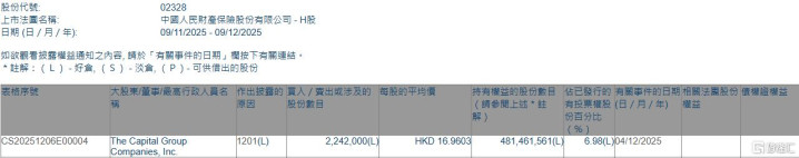 中国财险(02328.HK)遭The Capital Group减持224.2万股